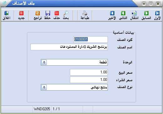 من هذه الشاشة يمكنك ادخال و تعديل بيانات أصنافك التي سوف تستخدمها فيما بعد في الحركات المخزنية أو في البيع والشراء