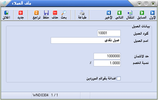 يمكنك ادخال عميل جديد بالنقر على زر جديد أو بكتابة كود العميل مباشرة ثم الضغط على مفتاح الادخال Enter